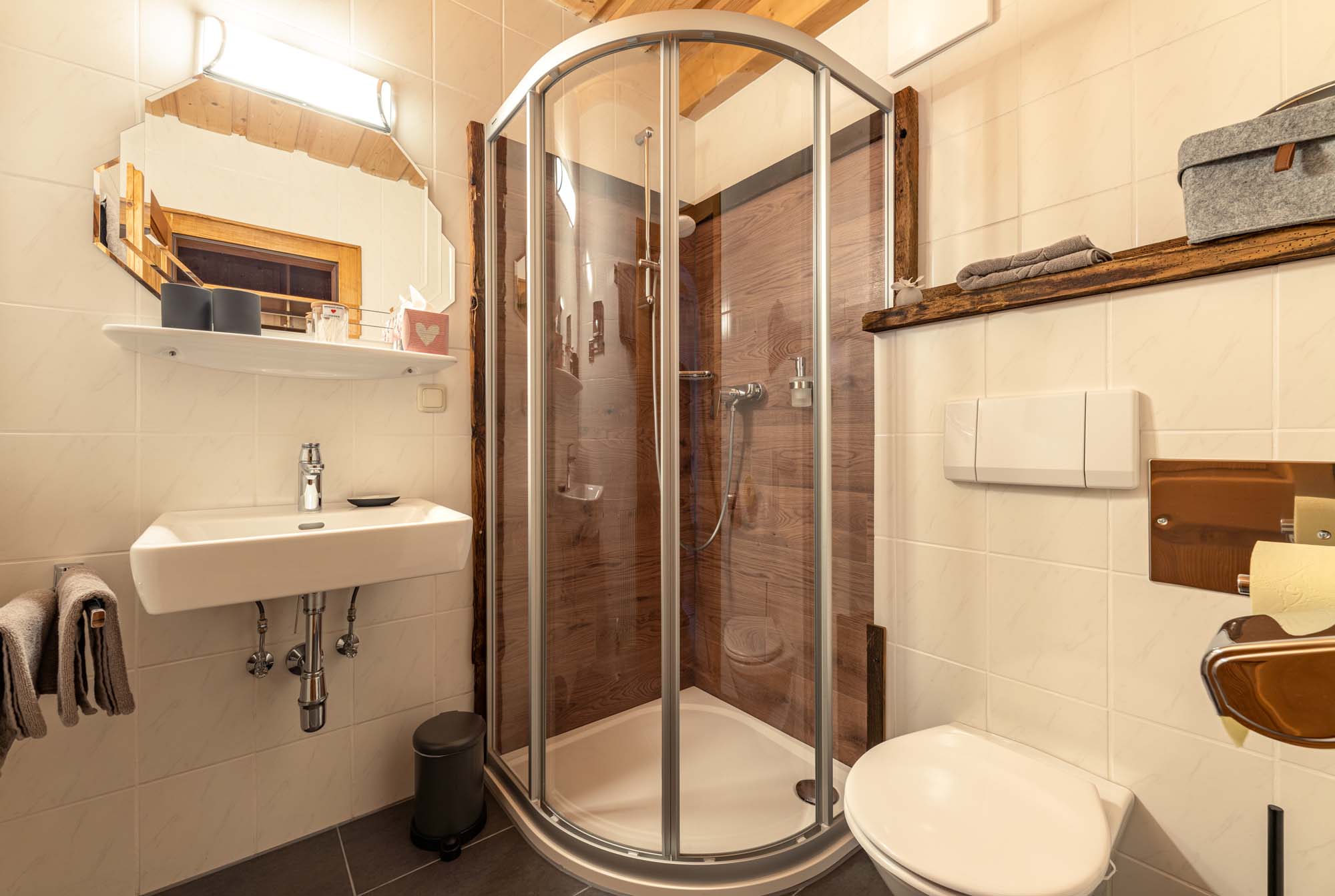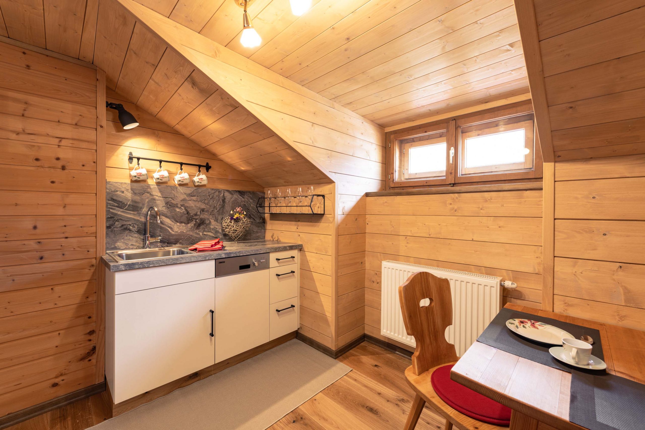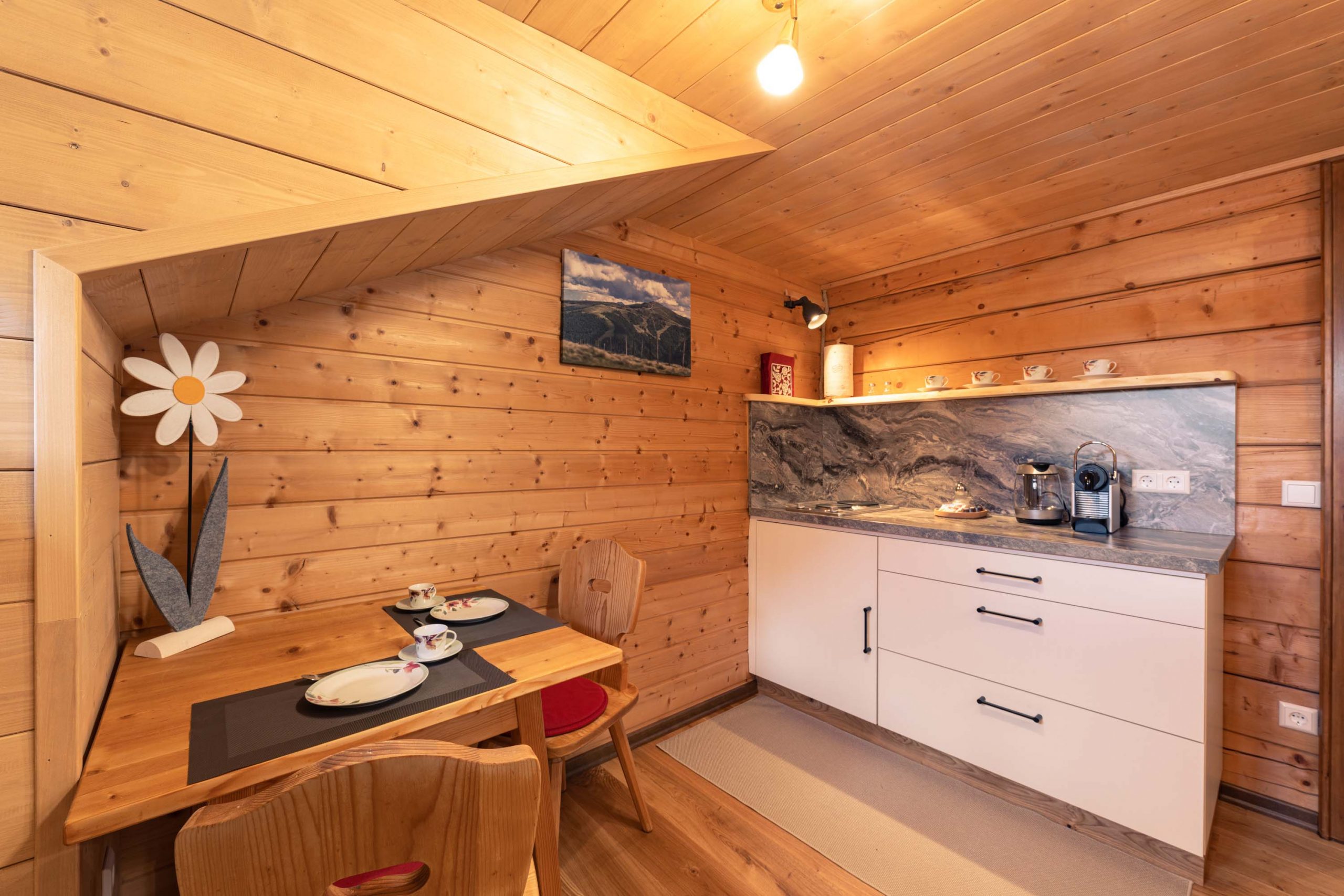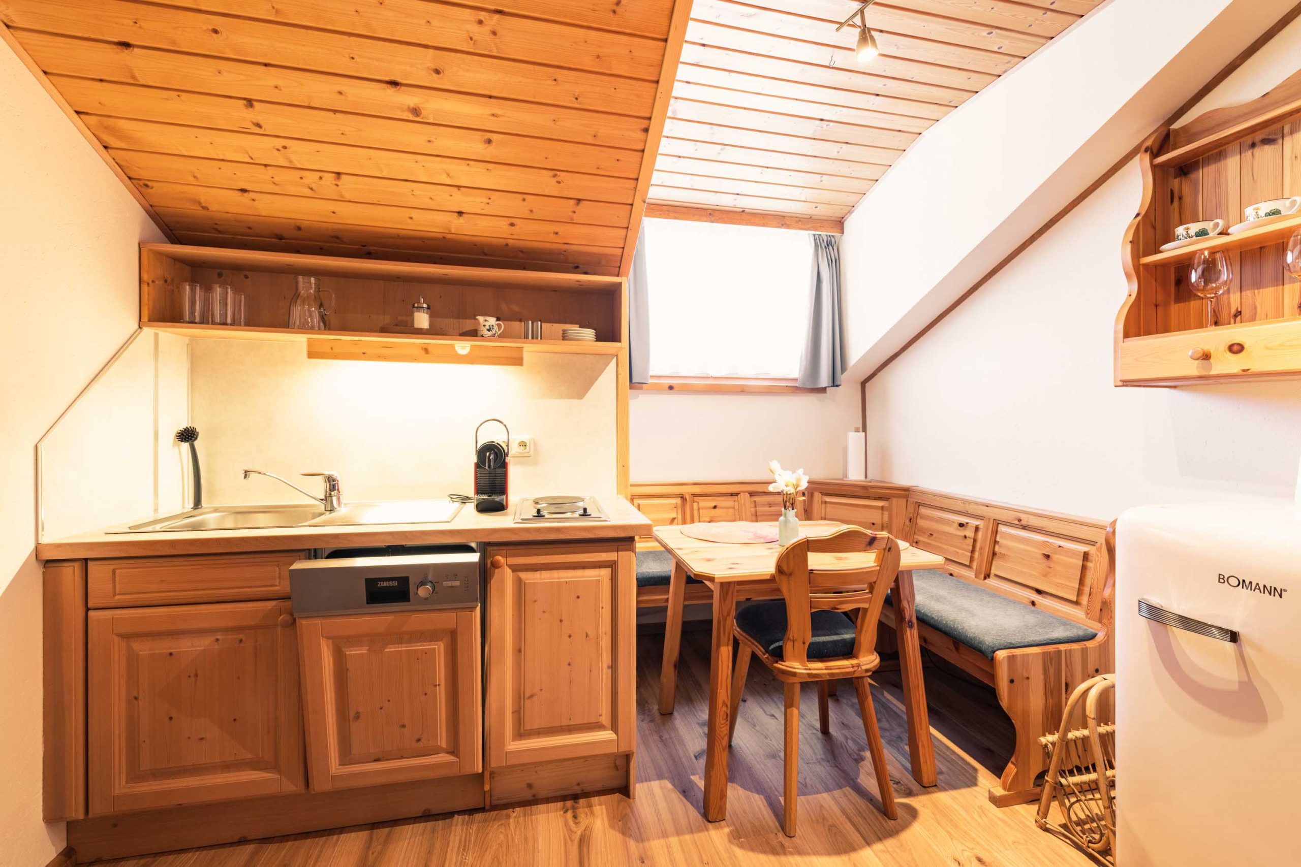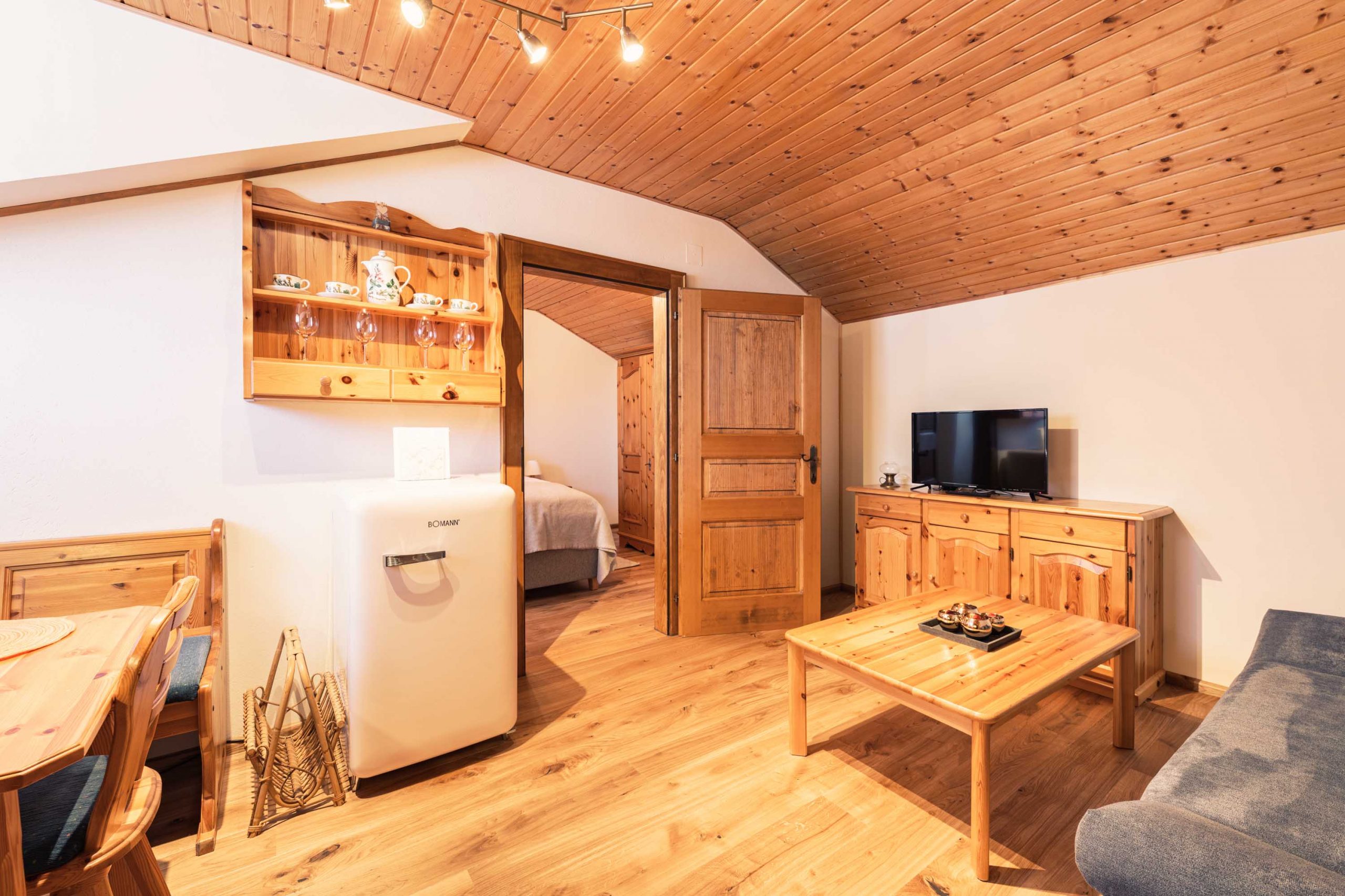 Comfortable 40 sqm for up to 3 persons with own entrance. The cosy kitchen-cum-living is the perfect place relax after a long day of skiing. There is an extendable couch in it where you can veg out. For those who don’t feel like going out for dinner, the small but well-equipped kitchen offers everything for cook your own. The kitchen offers: a two plate hob, a crockery, a dishwasher, a sink, a fridge, a coffee machine and dishes. To get a good night’s sleep there is a bedroom with enough space for your clothes. If this is not enough there is additional storage space in the foyer. For a good start into the day you can enjoy a shower in our originally designed bathroom.
