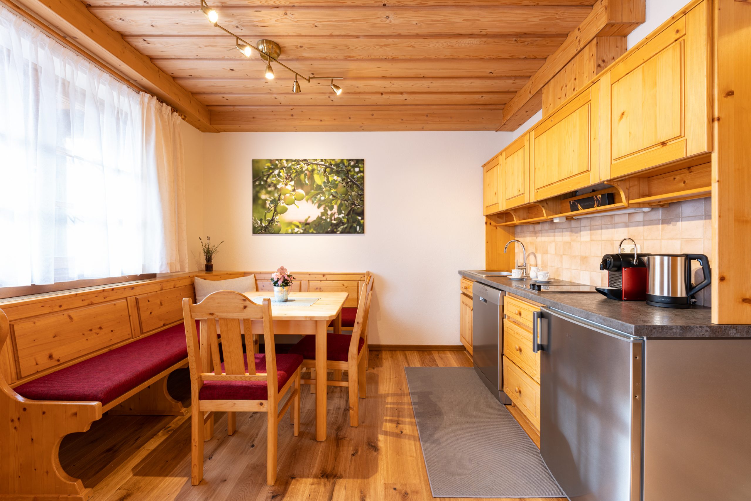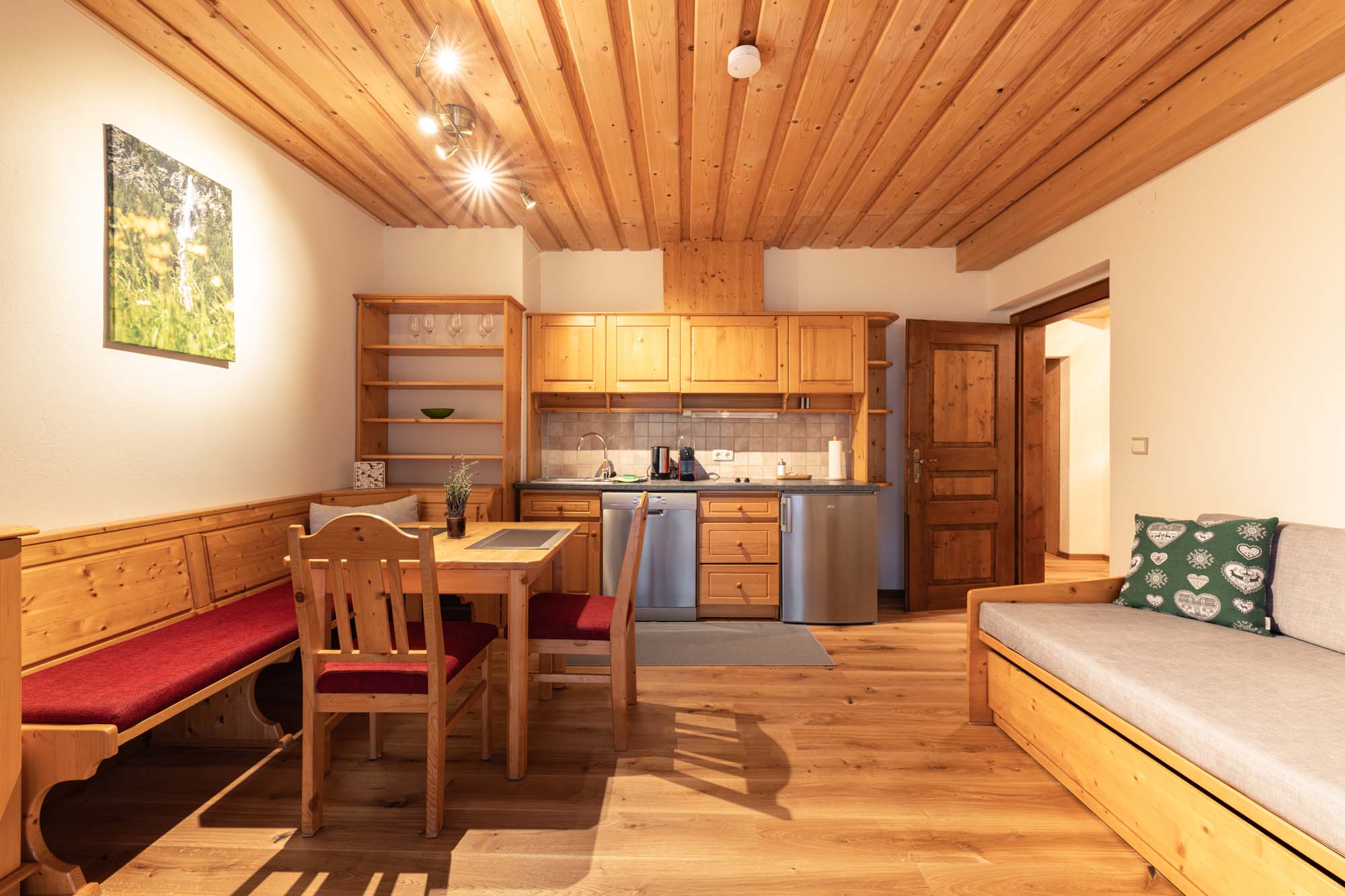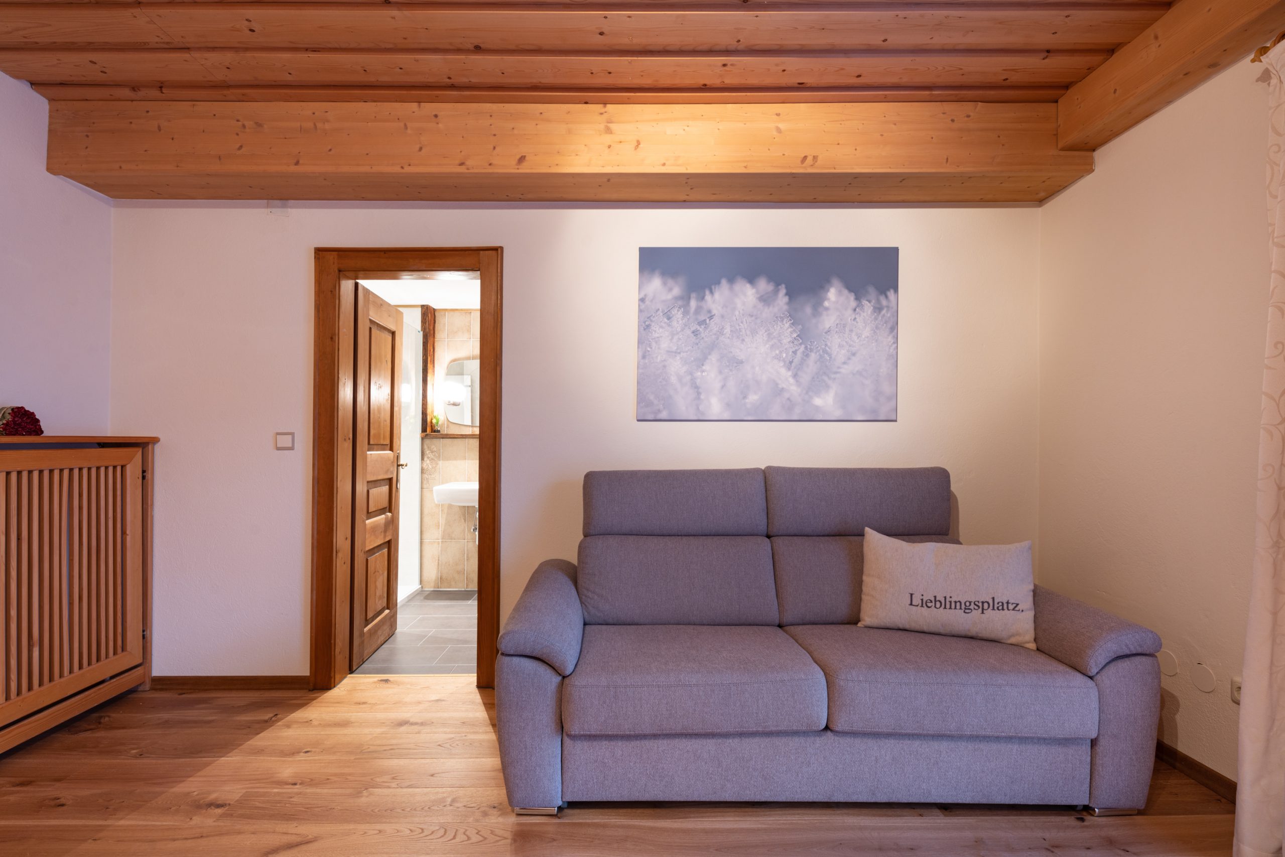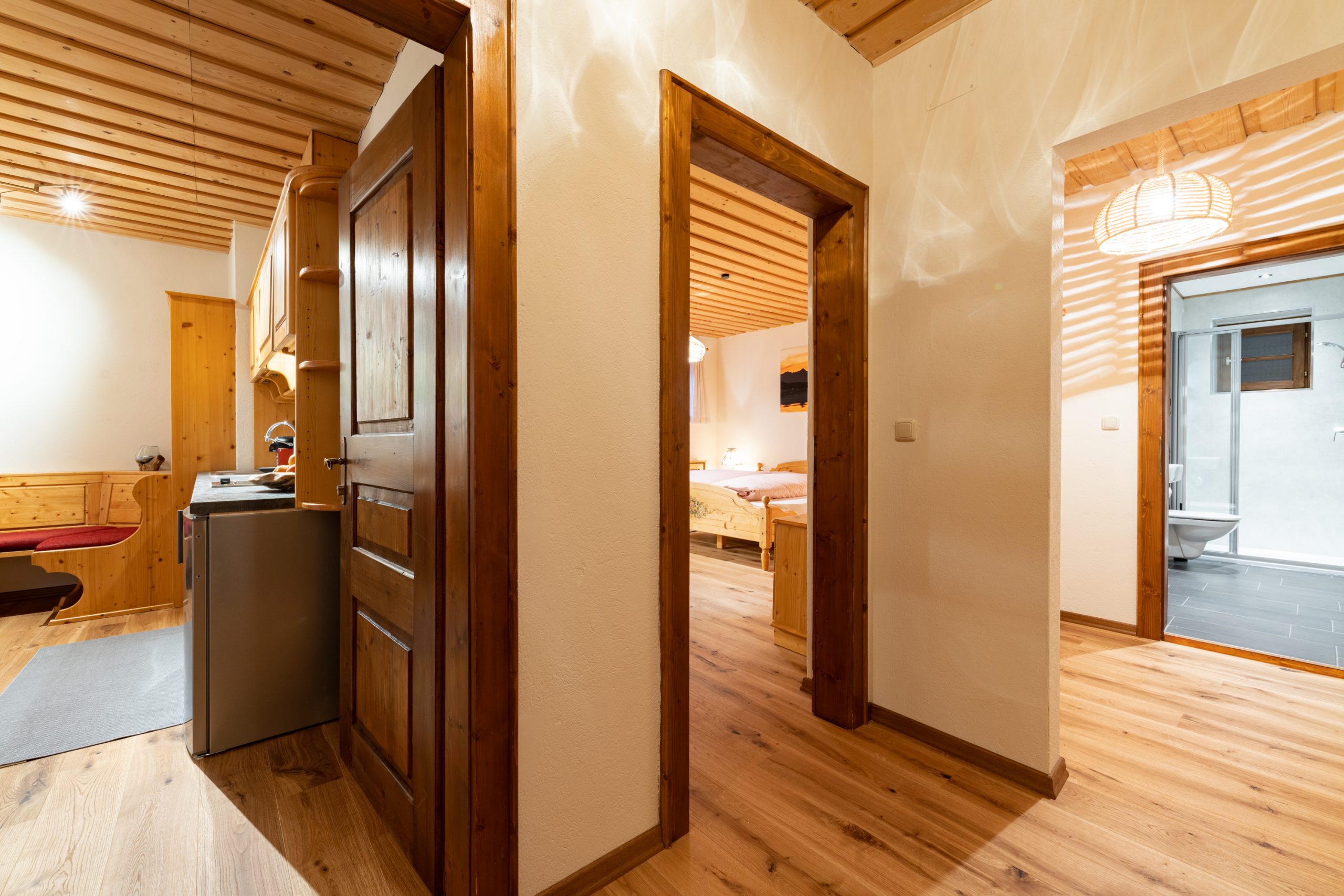 Comfortable 40 sqm for up to 3 persons with own entrance. The cosy kitchen-cum-living is the perfect place relax after a long day of skiing. There is an extendable couch in it where you can veg out. For those who don’t feel like going out for dinner, the small but well-equipped kitchen offers everything for cook your own. The kitchen offers: a two plate hob, a crockery, a dishwasher, a sink, a fridge, a coffee machine and dishes. To get a good night’s sleep there is a bedroom with enough space for your clothes. If this is not enough there is additional storage space in the foyer. For a good start into the day you can enjoy a shower in our originally designed bathroom.
