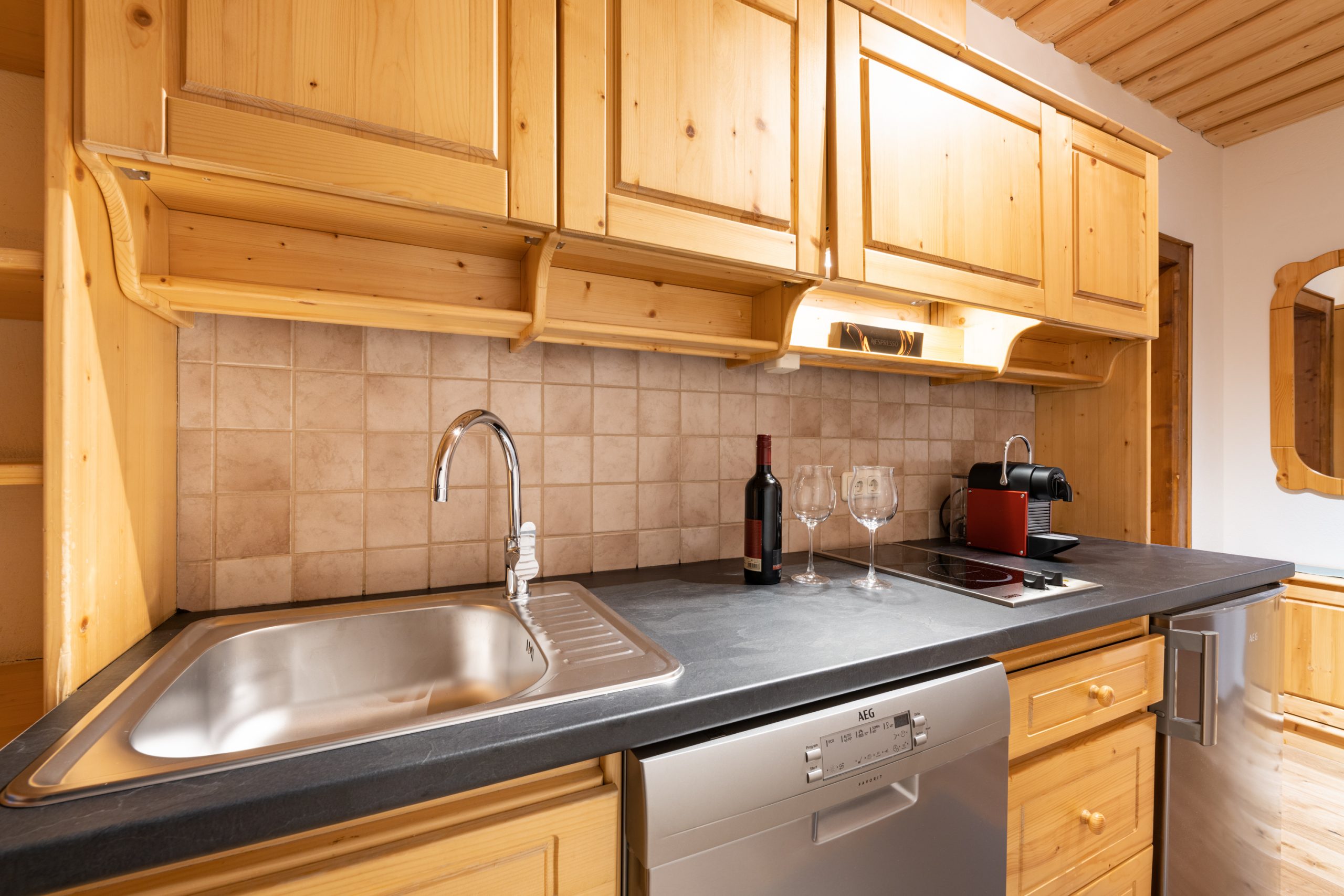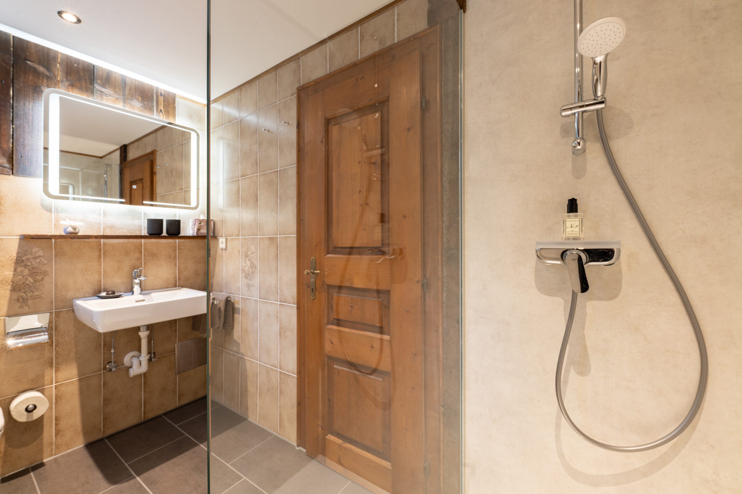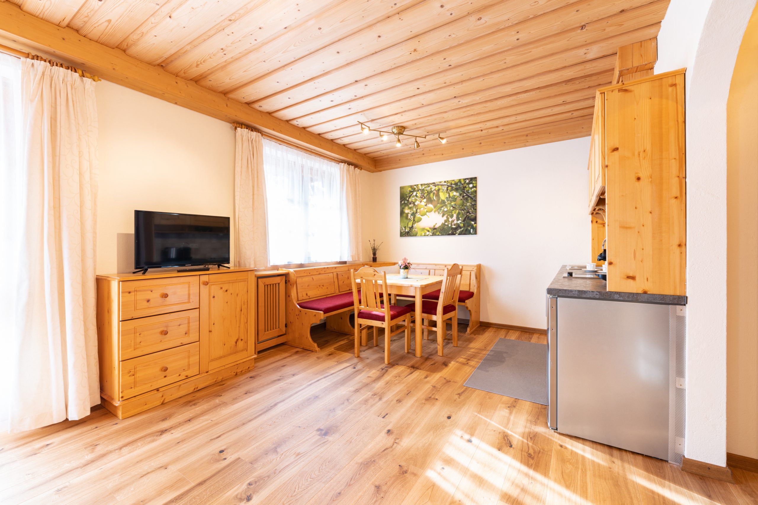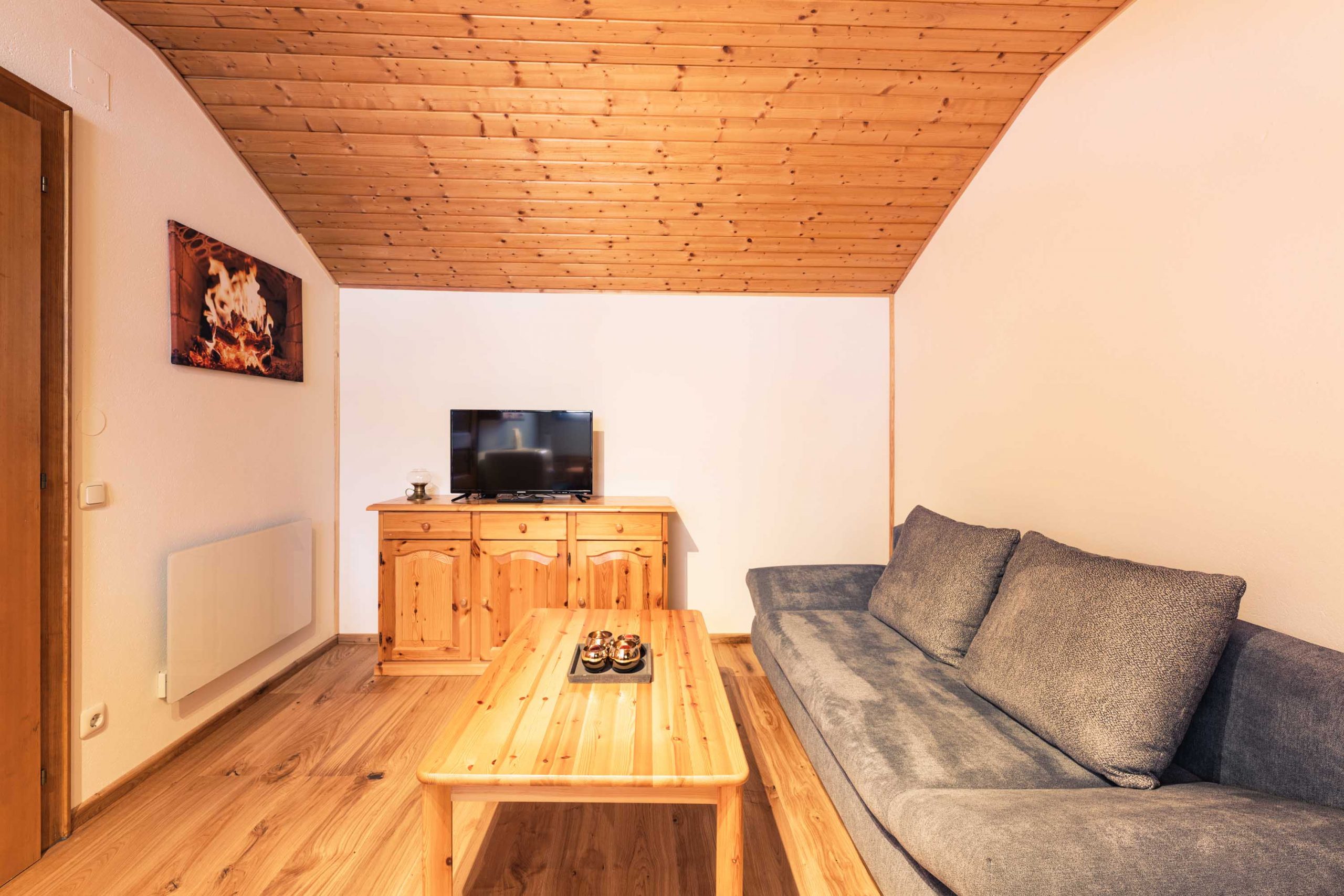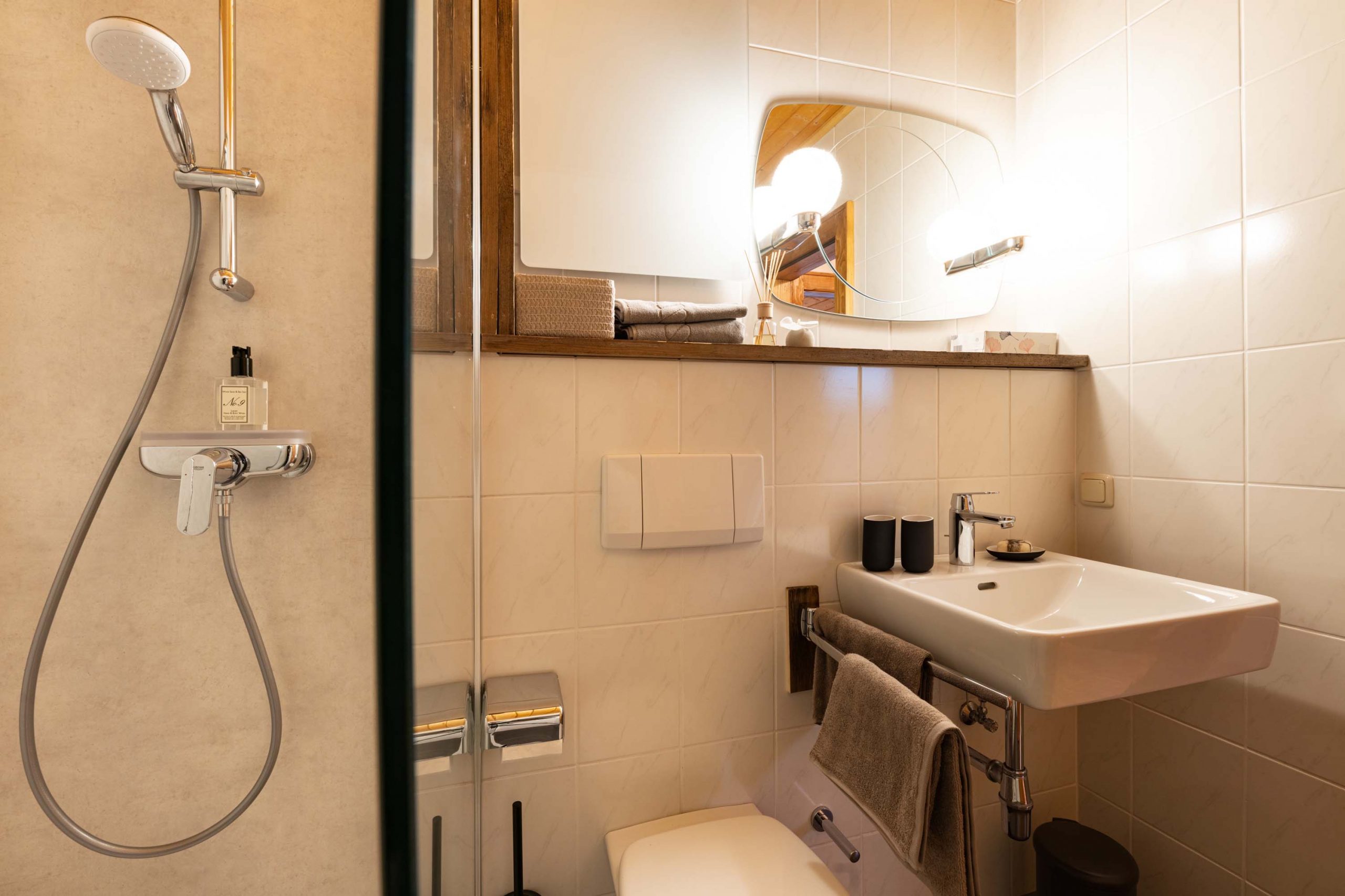 Comfortable 40 sqm for up to 3 persons with own entrance. The cosy kitchen-cum-living is the perfect place relax after a long day of skiing. There is an extendable couch in it where you can veg out. For those who don’t feel like going out for dinner, the small but well-equipped kitchen offers everything for cook your own. The kitchen offers: a two plate hob, a crockery, a dishwasher, a sink, a fridge, a coffee machine and dishes. To get a good night’s sleep there is a bedroom with enough space for your clothes. If this is not enough there is additional storage space in the foyer. For a good start into the day you can enjoy a shower in our originally designed bathroom.
