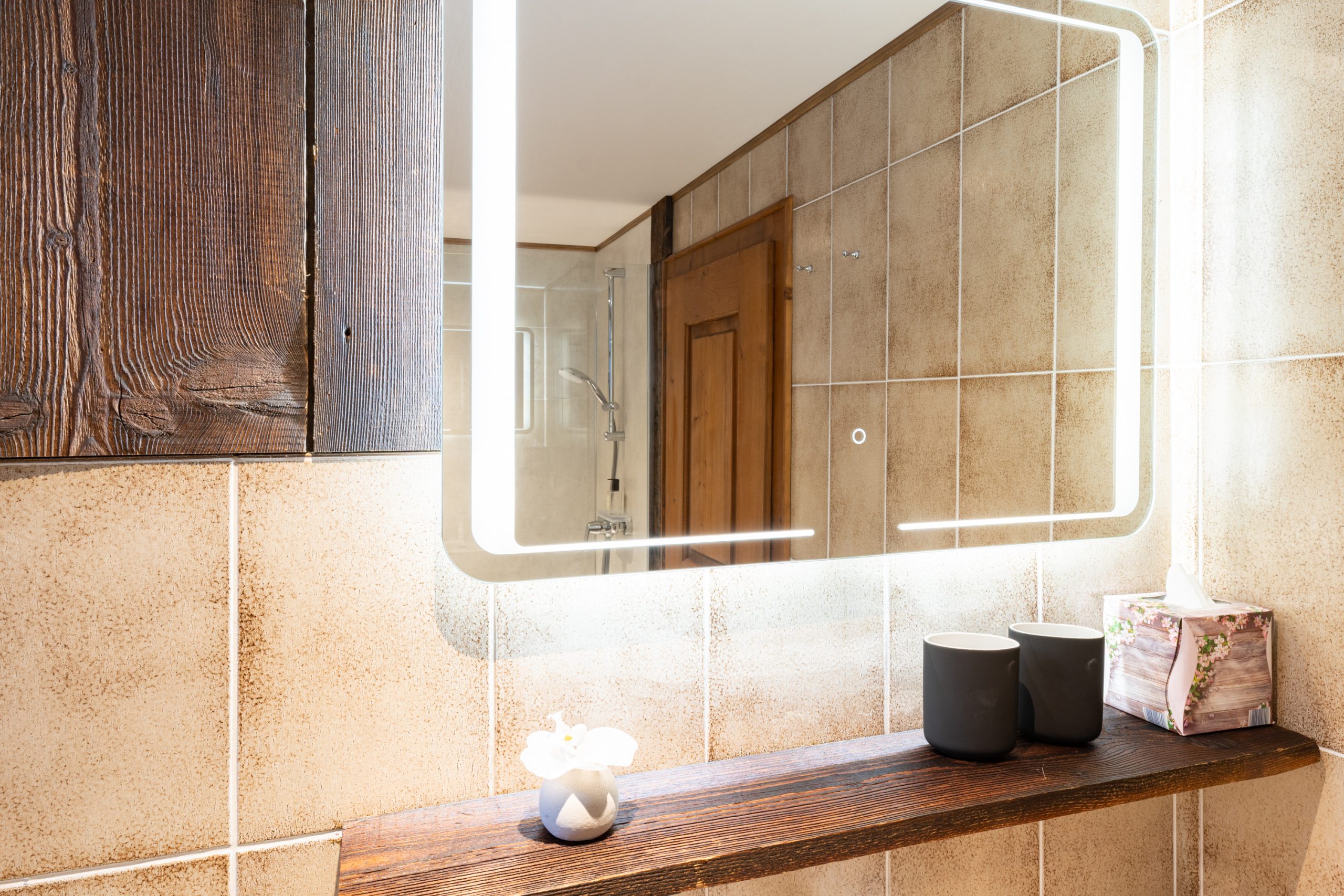 The spacious bathroom, designed with great attention to detail, guarantees a good start into the day.